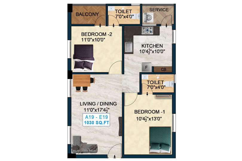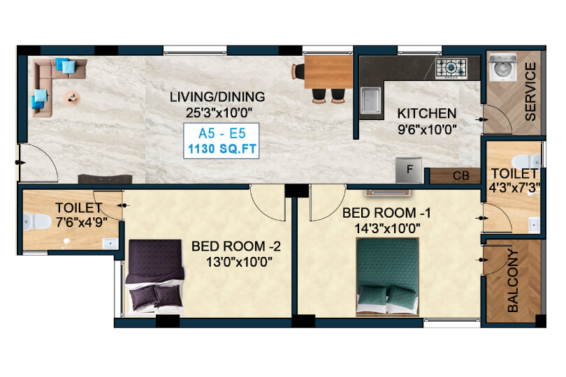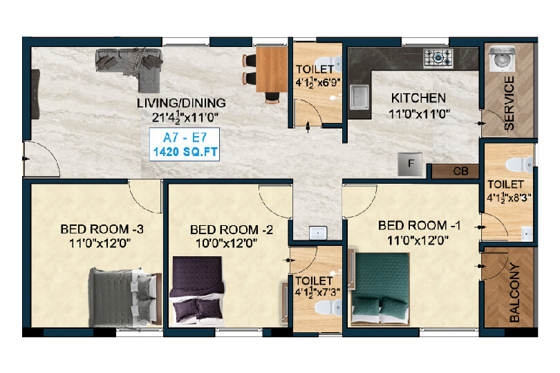 Glazed wall tiles upto 7 feet for all bathrooms & 2 feet height over the kitchen counter. Brand - Kajaria/Johnson/Somany.
