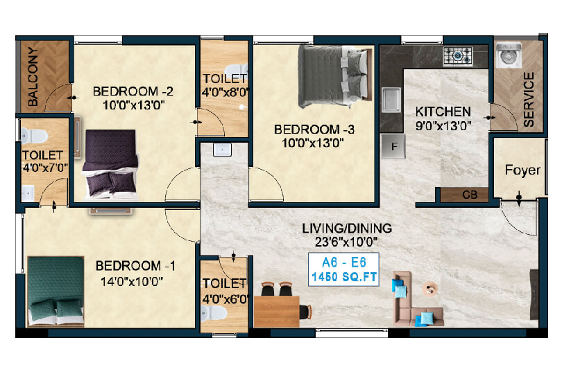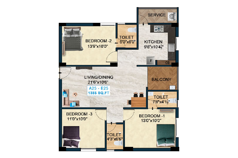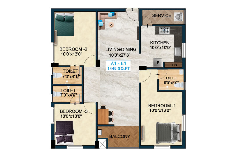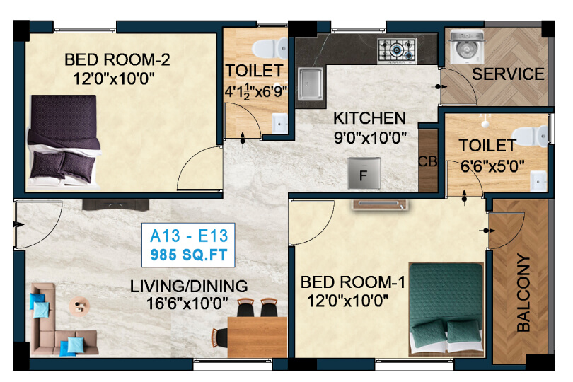 Polished Teak wood doors for main door, Laminated doors for all bedrooms. Wood composite polymer doors for Bathrooms/Balcony/Service.